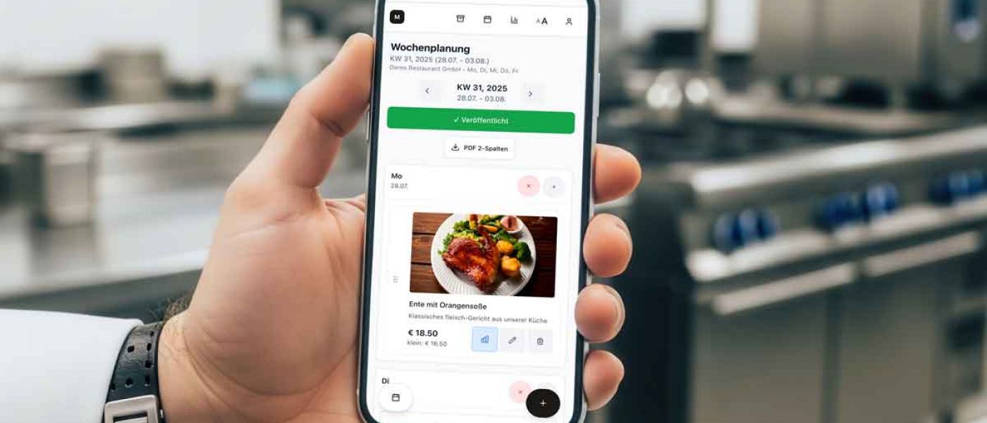 Der Mittagstischmanager wurde bewusst nicht am Schreibtisch gedacht, sondern im Küchenalltag getestet. Deshalb funktioniert er dort, wo Gastronomie stattfindet: in der Hand – nicht am Schreibtisch.